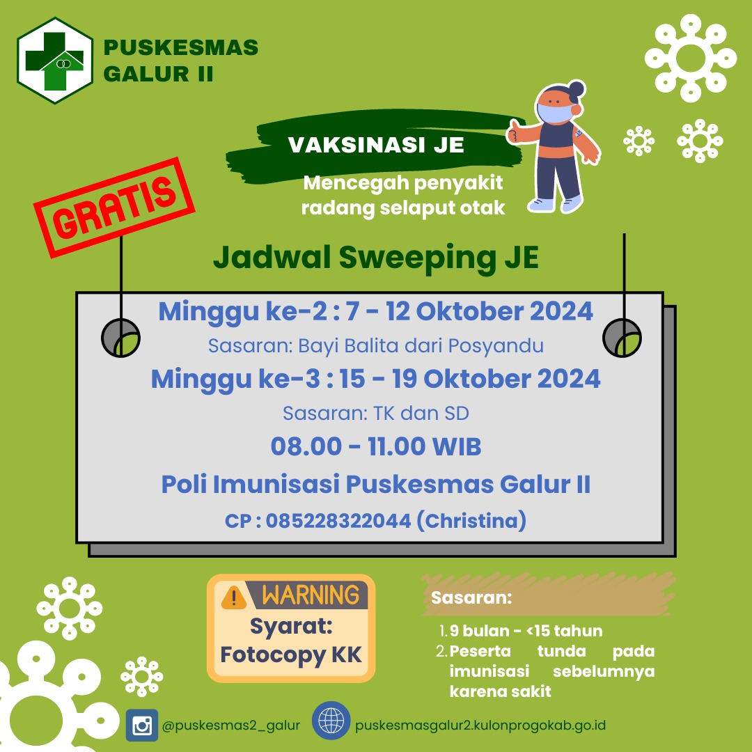 | 1 | 07 Oktober 2024 s.d. 19 Oktober 2024 | Jadwal Sweeping Imunisasi JE