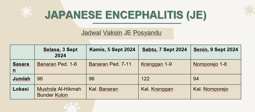 | 2 | 22 Agustus 2024 s.d. 02 Oktober 2024 | Jadwal Pelaksanaan Imunisasi Vaksin Japanese Encephalitis (JE)